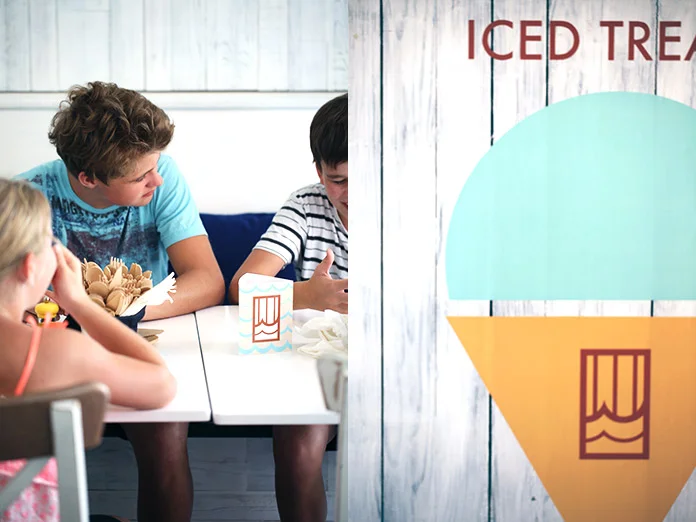 Beach-kitch, with its white, grey and blue tones. Seats dotted with sun kissed, barefooted and salty haired patrons.