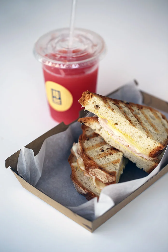 I run my index finger along the toasted grooves of my turkey cheese sandwich and take a bite. The lovely bread crunches well but I would asking for an extra slathering of mustard.